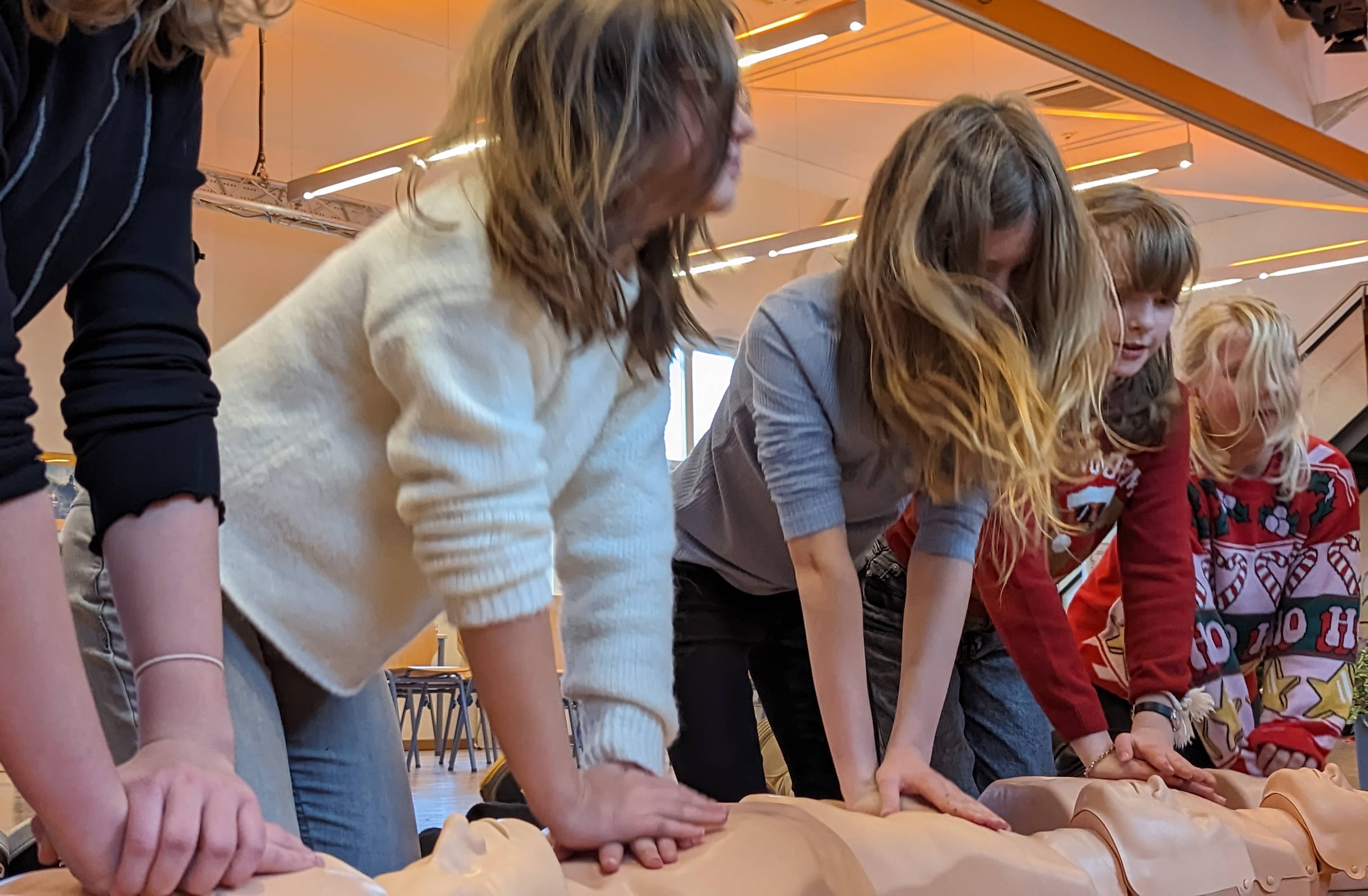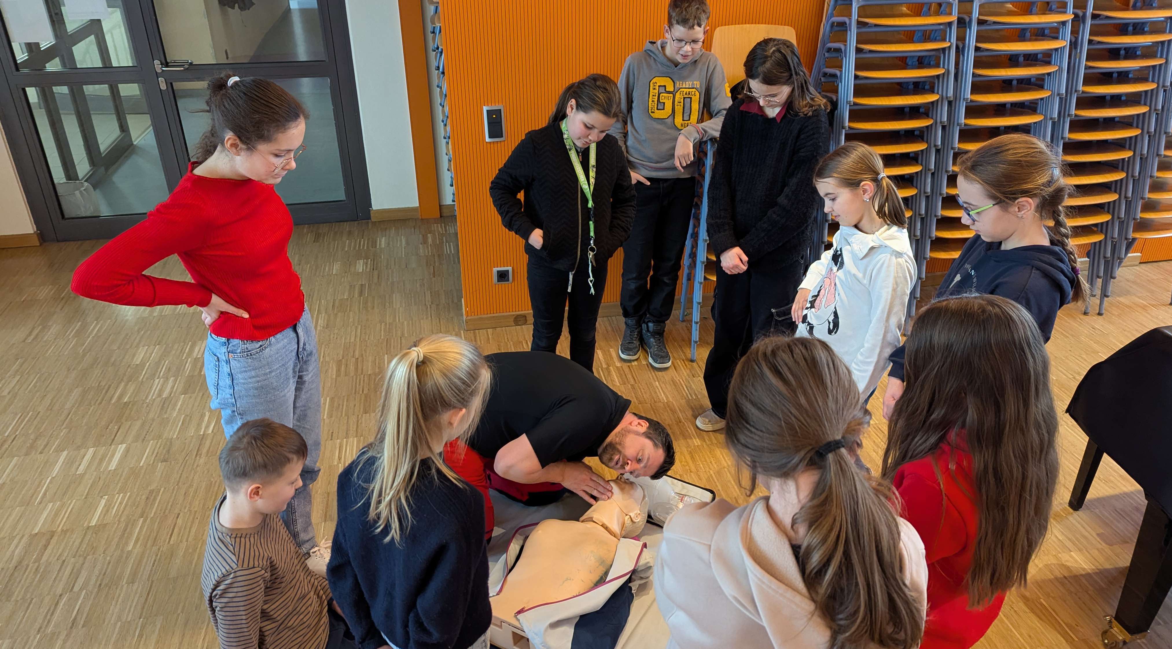 Am 24. Januar 2025 erlebten die Schüler der fünften Jahrgangsstufe jeweils zwei besonders interessante Stunden. Zwei "Profis", Notarzt Christian Ettl vom Heinrich-Braun-Klinikum und Notfallsanitäter Thomas Gerlach von der Besatzung des Rettungshubschraubers "Christoph 46", vermittelten, wie wichtig es ist, dass im Notfall nicht nur der Notruf 112 gewählt wird, sondern dass mit der Herzdruckmassage bei einem Notfallpatienten in der Zeit bis zum Eintreffen des Rettungsdienstes auch von Laien Leben gerettet werden können.