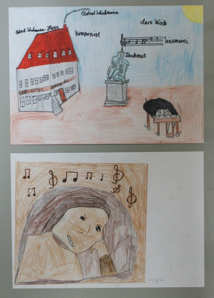 Die Schau zeigt Werke zum Thema "Robert Schumann" von unseren Schülerinnen und Schülern. Die drei 7. Klassen beschäftigten sich im Kunstunterricht unter der Anleitung ihres Kunstlehrers Christian Siegel mit Clara und Robert Schumann.