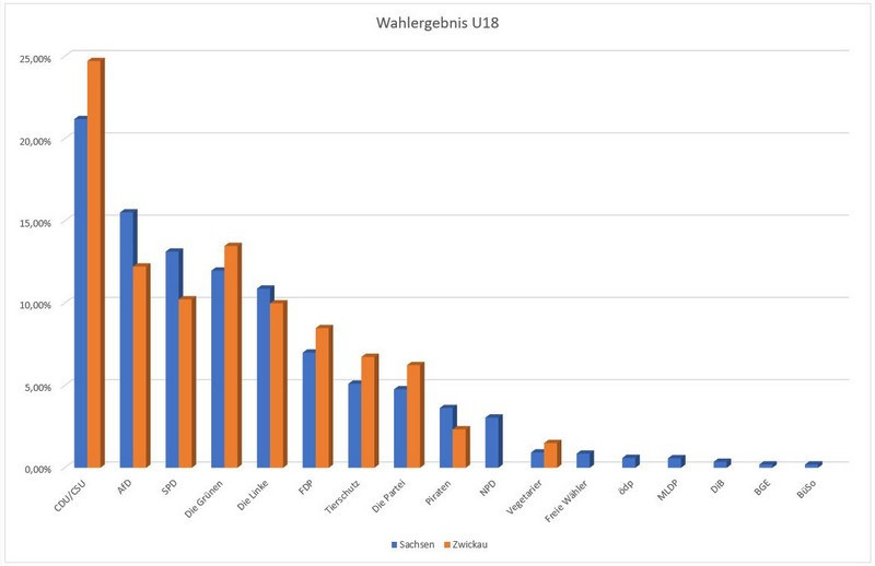 Bundesweit öffneten insgesamt 1622 Wahllokale für die U18-Wähler. In der Stadt Zwickau beteiligten sich 5 Schulen.
