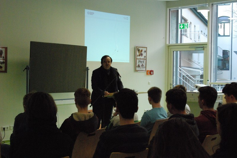 Mit diesem "Kompliment" an die Zuhörerschaft, die aus den Klassen 10b und 10c bestand, begann der Vortrag von Prof. Schmitz, der sich thematisch mit Heinrich Bölls Erzählung "Die verlorene Ehre der Katharina Blum" und deren Entstehungszeit befasste, letzten Freitag im neugestalteten Foyer.