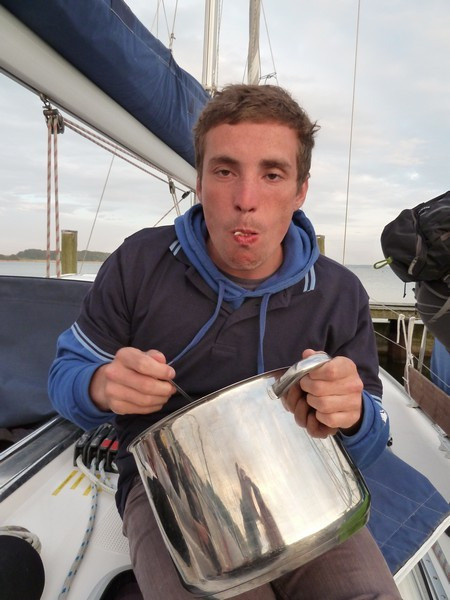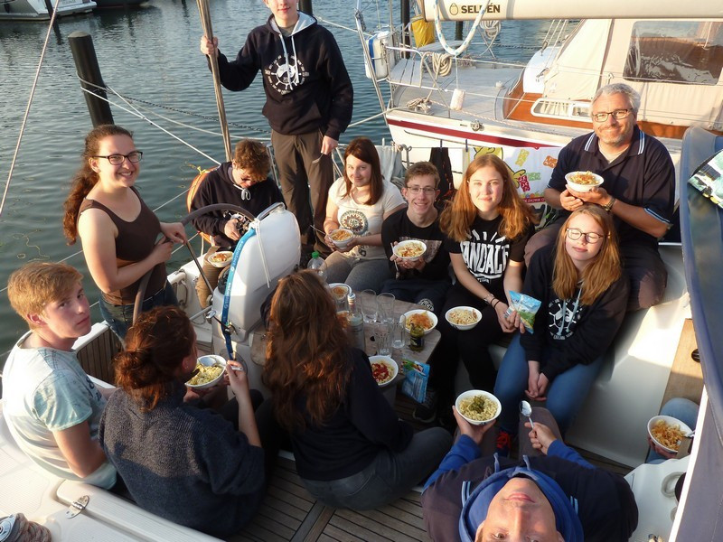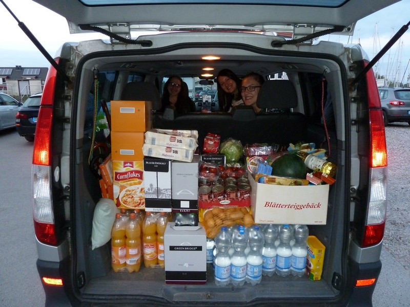 Dort vor Ort galt es zu aller erst, unseren Proviant ausgiebig aufzustocken. Dafür war ein Kleinbus nötig, den wir dann auf beide Boote GERECHT verteilten (die gesalzene Butter ist bis jetzt nicht aufgetaucht). Unser erster Abend hielt auch einige Überraschungen für beide Crews bereit ? aber im positiven Sinne (siehe alle Bilder mit blauen, bedruckten Pullis und hellem Logo). Dieses Outfit bekleidete uns die ganze Woche.