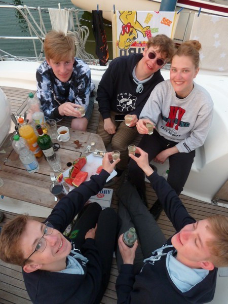 Kurz vor der Einfahrt in das Fahrwasser nach Greifswald ankerten wir und fast die ganze Mannschaft ging über Bord. Als dann auch Aladin wieder zu uns stieß, machten wir uns gemeinsam auf den Heimweg.