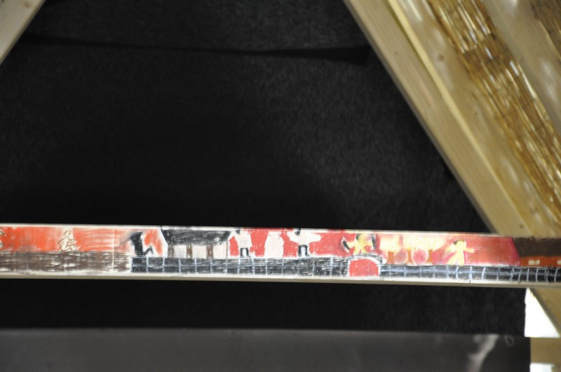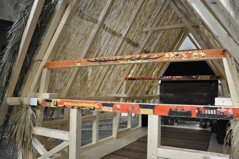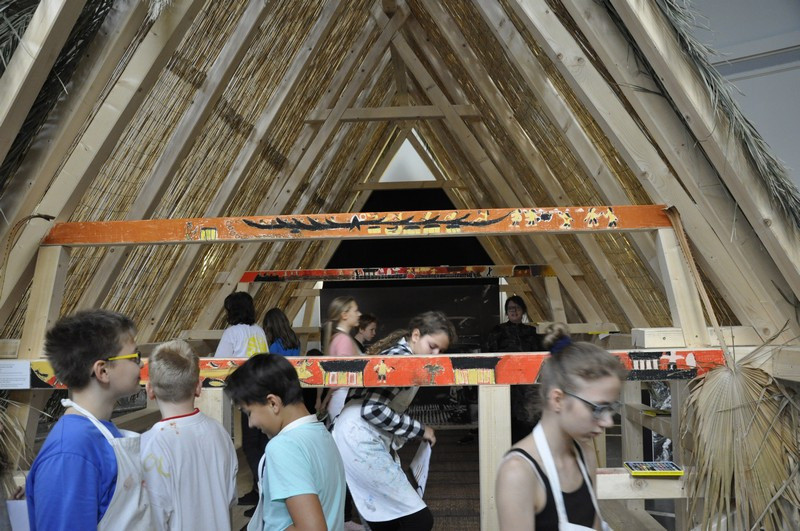 Unsere Aufgabe war es, die originalen Holzbalken aus Palau, die das Museum zeigen darf, nachzuempfinden und an der nachgebauten großen Hütte im Eingang des Museums mit Pastell- und Ölkreiden zu gestalten. Dabei wurden akrobatische, aber auch künstlerische Leistungen gefordert.