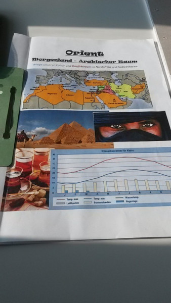 Die Klasse 7 hatte mit ihrem Projekt eine ganz besondere "Reise" vor sich. Den eigenen Kulturkreis verlassend ging es Richtung Morgenland. Eine Einführung in die geographische Lage füllte gegebenenfalls vorhandene Wissenslücken - wo wir uns hinbegeben wollen - erst einmal auf. Nun sollte jeder und jede erst einmal wissen, was heute als "Der Orient" bezeichnet wird.