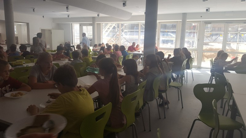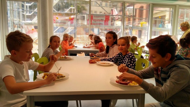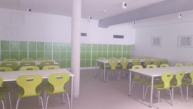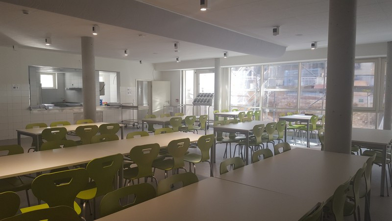 144 in gutgelauntem Neongrün gehaltene Stühle laden seitdem alle Schüler zum Mittagstisch oder kleinem Plausch mit Freunden ein; viele folgen dieser Einladung, und auch der "Lehrer- Stammtisch" (d.h. der Tisch der langjährigen Esser im Lehrerkollegium) blieb erhalten.