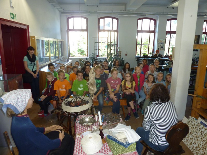 Am Anreisetag lernten alle viel über die Herstellung von Baumwollfäden (wir haben alle mal richtig gesponnen), das Weben, die ersten "Jaquard-Webcomputer" und vieles mehr im Textilmuseum. Nach einem einstündigen Fußweg zum Bethlehemstift gab es Makkaroni, bis zum Abend wechselten sich Gemeinschaftsspiele und selbstgestaltete Freizeit miteinander ab. Pizza zum Abendbrot und schnell wieder raus, denn ab 20.00 Uhr sollten alle zum "Kinoabend" (Schatz im Silbersee auf die Leinwand gebeamt) auf dem Boden des Waldhauses (so hieß unsere Unterkunft) sein.