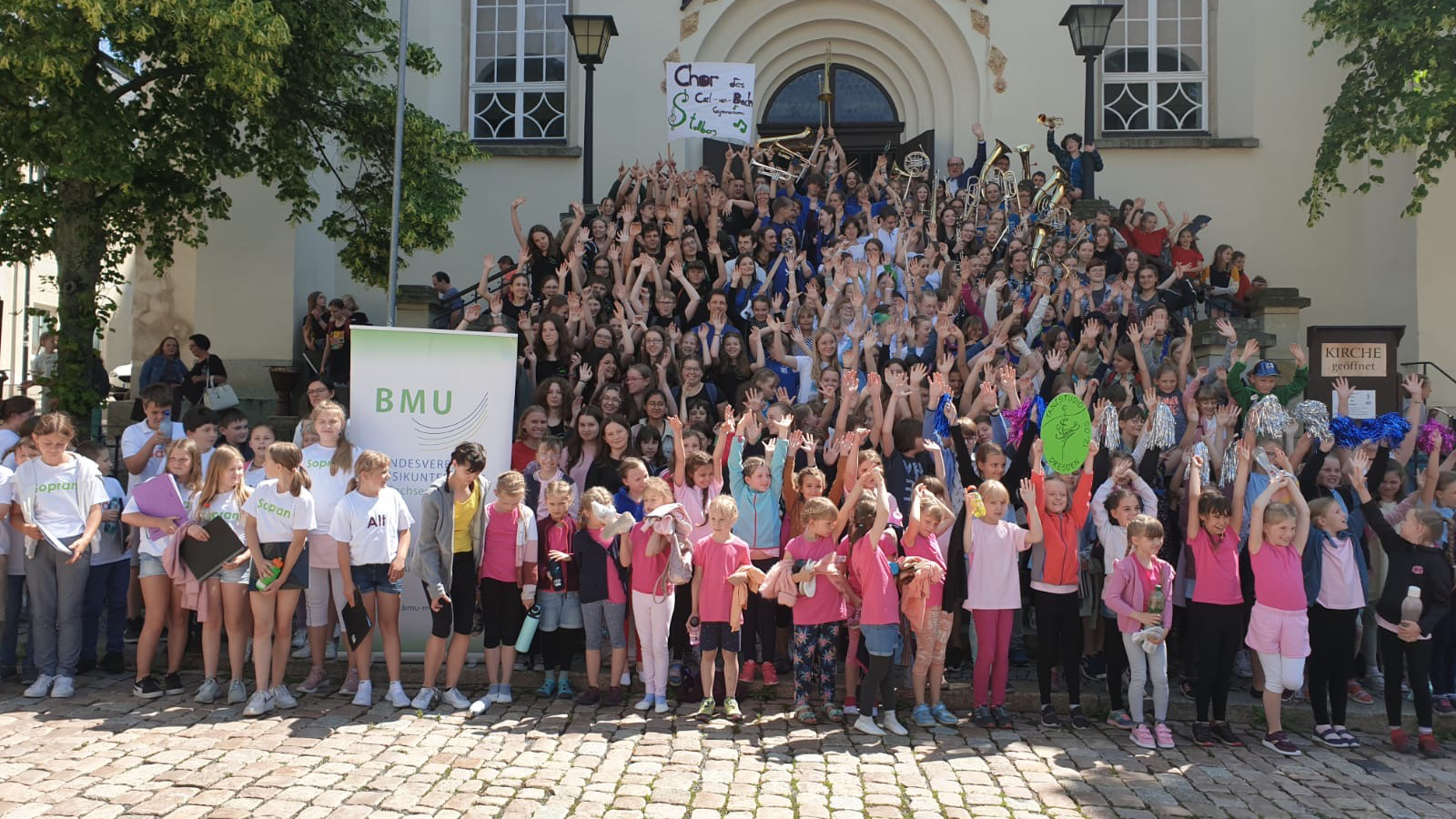 Jedes Jahr treffen sich im Sommer hunderte Schülerinnen und Schüler sächsischer Schulen, um gemeinsam zu musizieren. Dieses Jahr kamen 15 verschiedene Ensembles, u.a. aus Bischofswerda, Bautzen, Dresden und Riesa nach Westsachsen. Unser Chor der 5.-7. Klassen und die Trommelgruppe nahmen am 24. Juni 2023 an der Begegnung „Schulen musizieren“ teil.