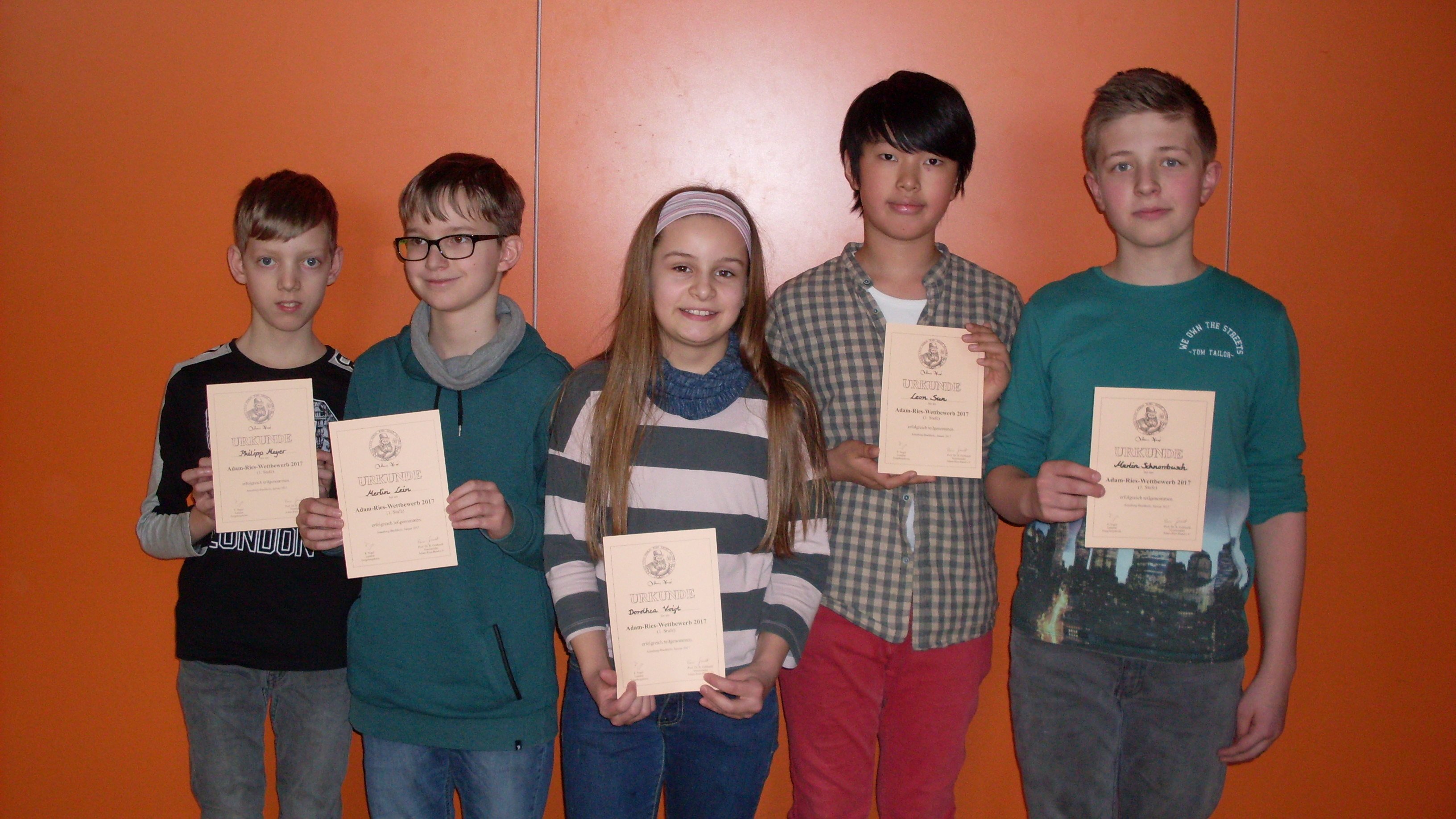 Fünf Schüler aus unserem Peter-Breuer-Gymnasium beteiligten sich neben dem Hausaufgabenteil erfolgreich an der Klausurrunde der ersten Stufe des Adam- Ries-Wettbewerbes 2017 in der Schule und erhielten eine Urkunde. Sie wurde vom Adam-Ries-Bund e.V. Annaberg-Buchholz verliehen.
