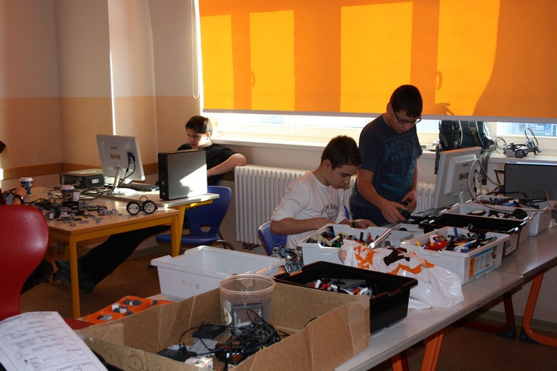 Da wir ja nicht nur mit den Plastikbausteinchen bauen, sondern unseren Ergebnissen auch "Leben einhauchen", war ein Computer für jedes Team von Nöten. In der alten Informatik abgebaut, wurde feldmäßig ? wie bei einer LAN-Party ? ein Klassenzimmer zur LEGO-Schmiede hergerichtet. (Die alte Informatik war bereits den Baumaßnahmen "zum Opfer gefallen").