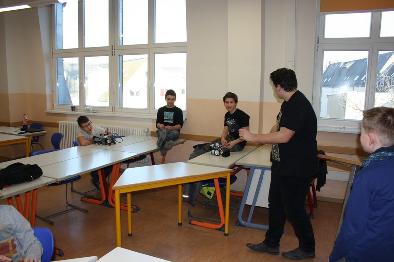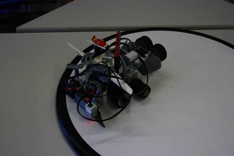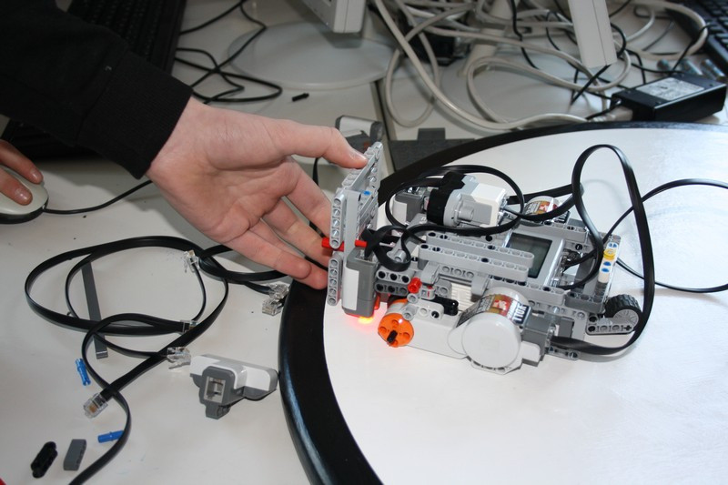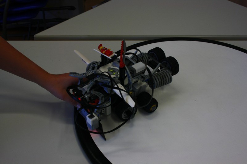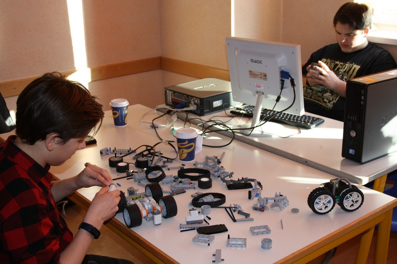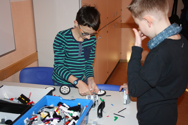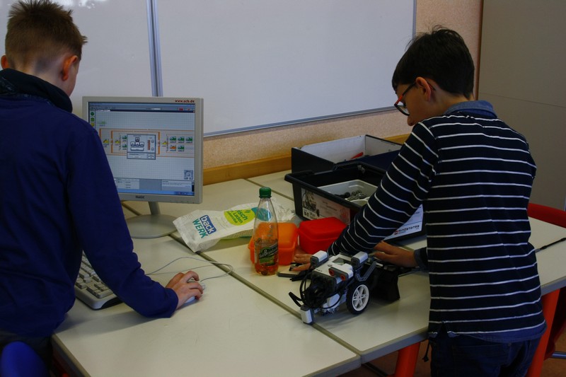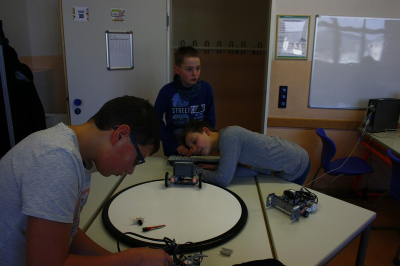 Bald "rollten" die ersten Boliden über die Tische. Und schon wurde an der Wettkampfarena getestet, ob er den Ansprüchen genügt. Während sich die 5. Klasse mit der englischen Version der Programmieroberfläche herum quälte, suchen zwei größere Jungs nach der optimalen Lenkung. Erstere konnten mit einem Oxford-Wörterbuch unterstützt werden, während letztere leider den Traum von vier Rädern aufgeben mussten.