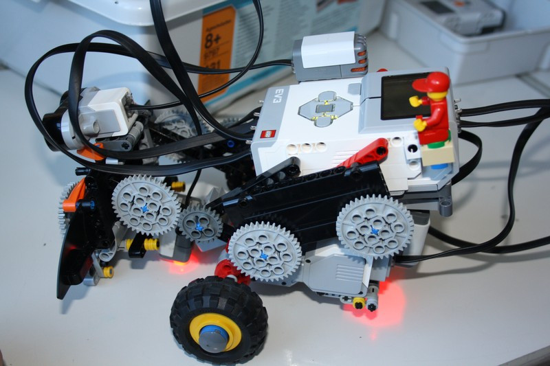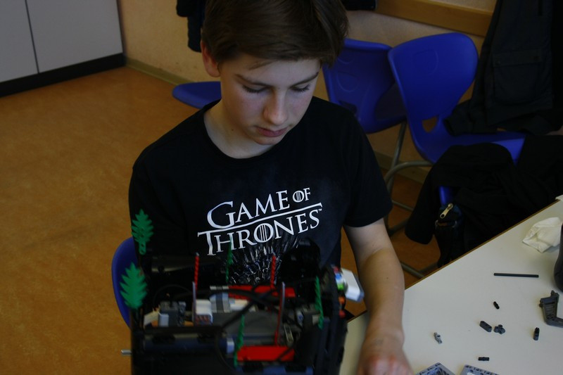 Danach ging es auch schon los. "Also wenn mein Roboter seinen Gegner von der Wettkampffläche schubsen soll, was muss er denn da können?". Er sollte zunächst eine große Gewichtskraft in Kombination mit hoher Reibung haben. Alle Begriffe aus Physik 7. Klasse. Endlich eine Anwendung. Ob es verstanden wurde, zeigte sich beim Wettkampf. Und was nehm? ich denn da? Ketten, breite Reifen, lieber vier als zwei Räder?? Alles Fragen, die an den Konstrukteur hohe Anforderungen stellen.