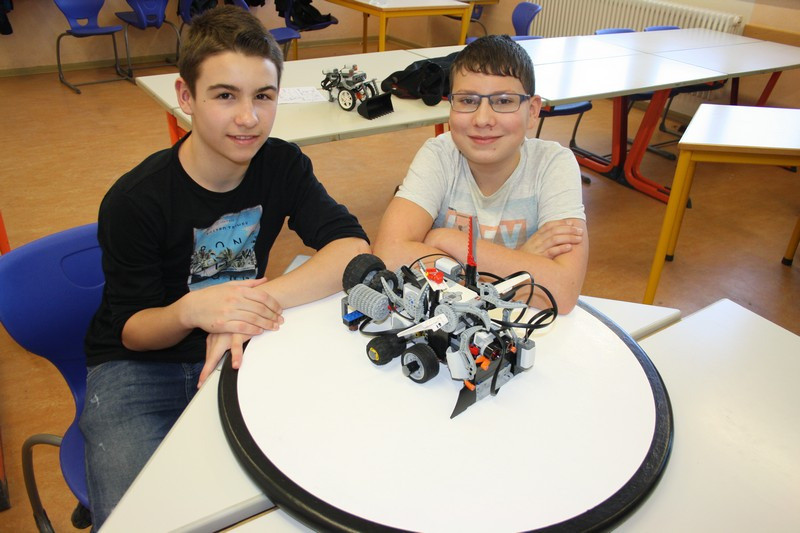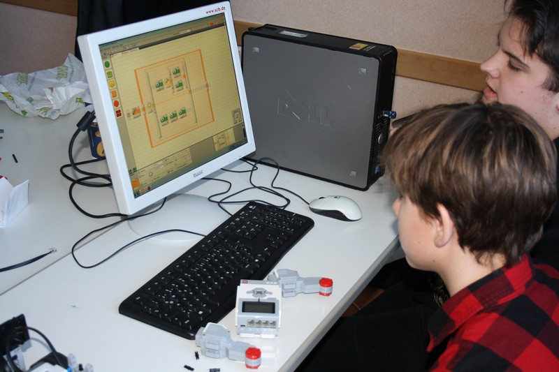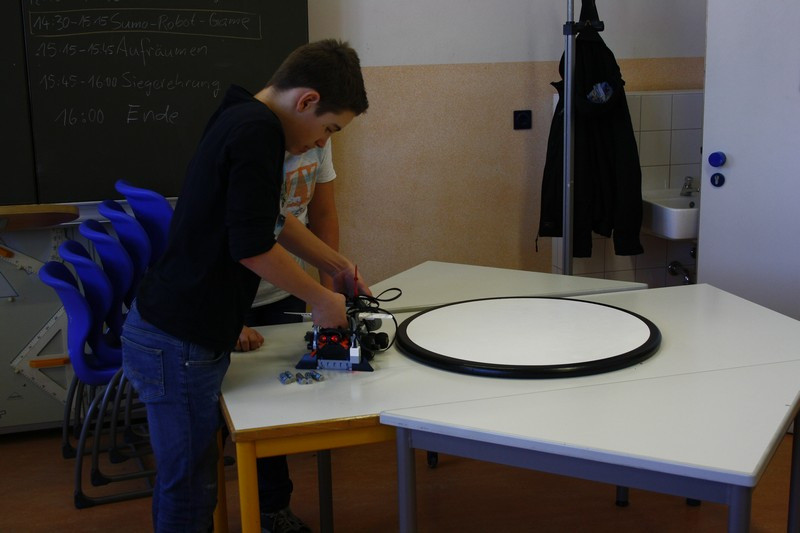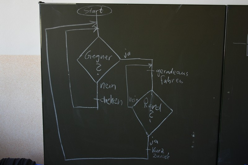 "Meiner sieht seinen Gegner nicht", "Warum fährt er denn immer wieder allein von der Arena runter?". Das waren Fragen, die uns am zweiten Tag beschäftigten? So wurde umkonstruiert, umprogrammiert, überlegt und getüftelt. Manchmal half ein einfacher Programm-Ablauf-Plan weiter, manchmal eine kleine Trainingsrunde mit Dr. Daßler.