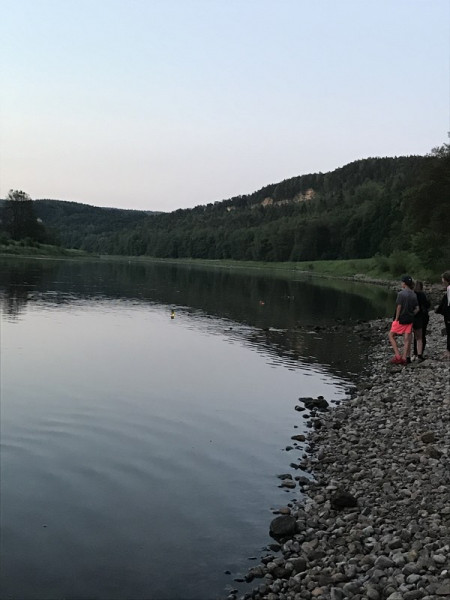 Danach ging es noch straffe 3 Stunden am Elbufer entlang bis hinter das "Blaue Wunder", wo sich unser neues Zeltlager befand. Nach dem Abendessen genossen einige noch die Zeit am Ufer der Elbe, um Spiele zu spielen und den herrlichen Blick auf die beleuchtete Stadt zu genießen. Andere blieben in den Zelten und beschäftigten sich ebenfalls mit Spielen.