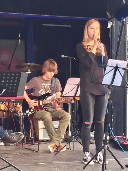Da die meisten Bandmitglieder schon in den Ferien waren, vertraten Liska und Malcolm aus der Klasse 9a zusammen mit Herrn Scheffler die sonst fünfköpfige Bandformation der Schule.