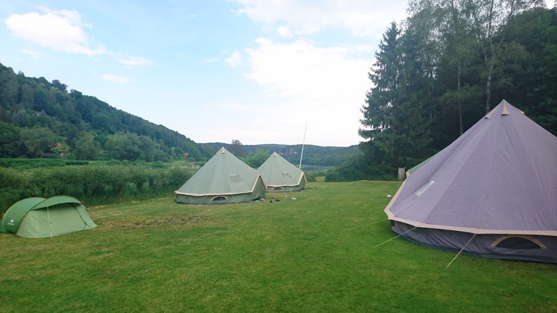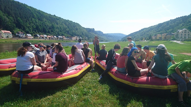 Im beschaulichen Krippen angekommen, wurden wir von unseren Guides Ilka (gerufen auch Ikea) und Falk freundlich empfangen und wenig später sportlich gefordert. Zu zehnt saßen wir in einem Boot und paddelten elbabwärts, was Teamarbeit und Teamgeist erforderte. Die knapp 10 km Wasserweg wurden von uns nicht am Stück zurückgelegt. In einigen Badepausen, in denen wir uns zum Beispiel vom Strom der Elbe treiben ließen, konnten wir etwas Kraft tanken. Müde und etwas erschöpft kamen wir am Campingplatz an und bezogen je gruppenweise ein Tipi. Nun fehlte nur noch das Abendbrot. Da es keine angestellte Köchin gab, durften wir kochen - natürlich nicht als ganze Klasse, sondern wieder in Gruppen, die jeden Tag wechselten. Nach einer kleinen Vorstellungsrunde gingen wir 22:00 Uhr ins Zelt. Ans Schlafen war nach einem solch ereignisreichen Tag allerdings noch lange nicht zu denken.