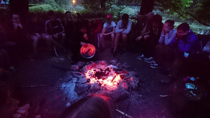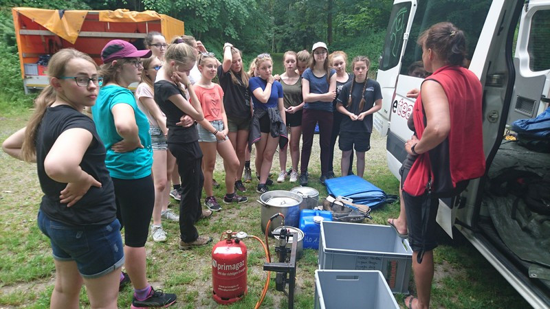 Der zweite Tag begann mit einer GPS-Wanderung, bei der die Mädchen gegen die Jungs antraten. Das Mädchenteam wurde von Frau Jacobi, die Jungs von Herrn Jahn begleitet. Wir bewältigten alle Aufgaben sehr gut, kamen zum Beispiel kostenlos mit dem Schiff zu anderen Seite der Elbe oder kauften das Abendessen zusammen. Während wir Mädchen Spaghetti mit einer leckeren Sauce kochten, bereiteten die Jungs einen Linseneintopf aus der Dose zu. Auf die anschließende Nacht, die wir im Freien verbrachten, waren total gespannt: der Bio-Lärm, das aufs Klo Gehen im Wald und das auf dem Boden Schlafen waren Highlights unserer Tour.