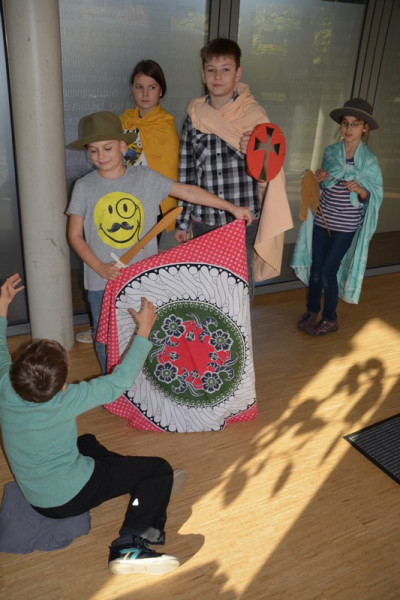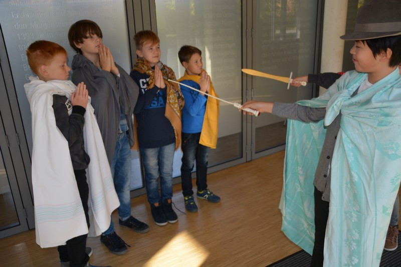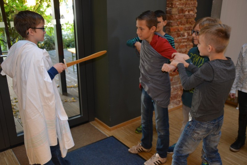 Aus der gut gefüllten Kirche ging es zur Manufaktur, dem dazugehörigen Gemeindehaus. In fünf Stationen begegneten die Schüler auf vielfältige Weise den drei Heiligen. Sie lernten ihre Legenden und Symbole kennen, stellten Schlüsselszenen aus ihrem Leben nach und konnten sogar über de-ren Leben und Wirken rappen. Von Pater Welscher erfuhren die Kinder, wie man denn nun "offiziell" heilig wird. So gab es auch für Schüler, die sich schon besser auskannten, etwas Neues zu ent-decken und zu erleben.